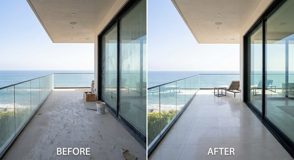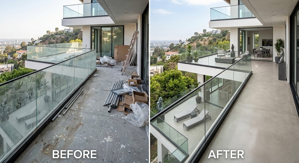 This pair shows a post-construction cleaning of a coastal villa’s balcony in Pacific Palisades, featuring a stunning ocean view.