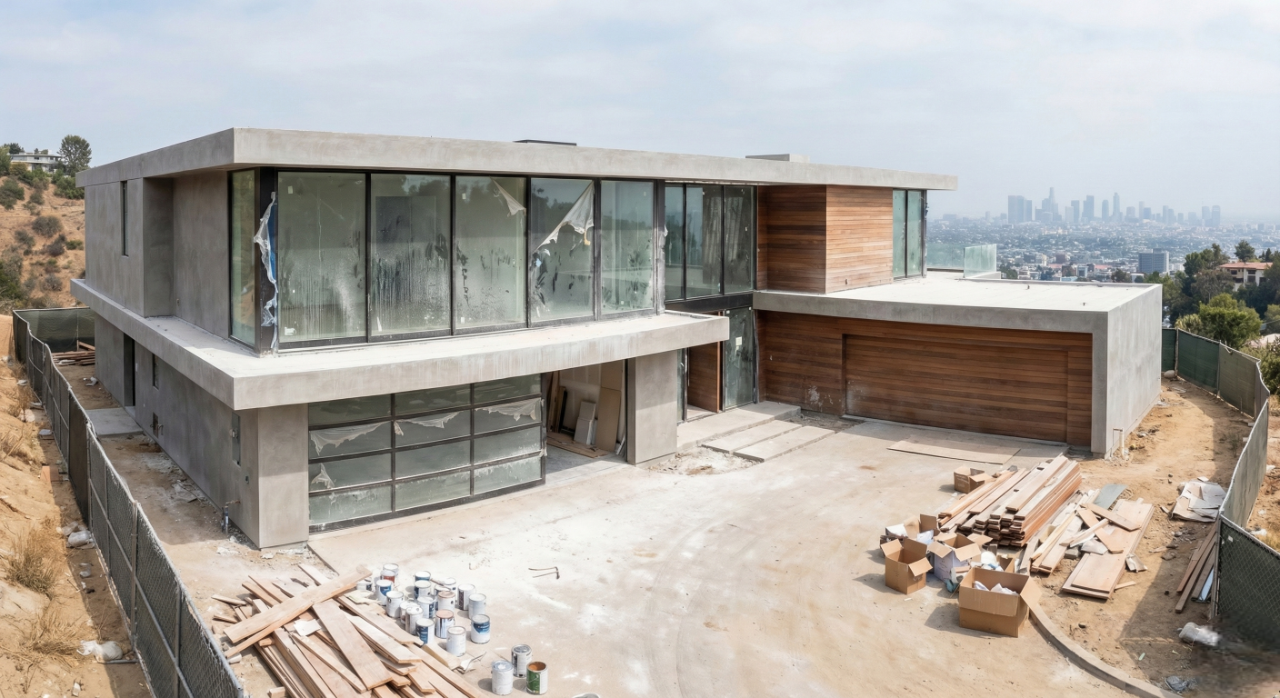 The exterior of the villa is coated in fine construction dust. The windows are streaked, and the grounds are littered with leftover building materials, tools, and a temporary fence.