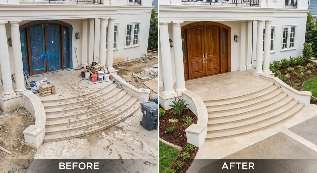 This pair shows the post-construction cleaning of the grand entryway of a coastal villa in Pacific Palisades.
