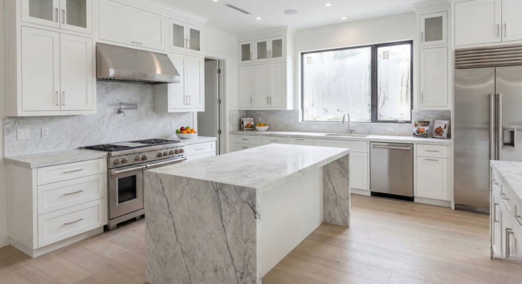 This high-end kitchen in a Bel Air villa required meticulous cleaning of all surfaces, including the marble countertops, custom cabinetry, and high-end appliances.