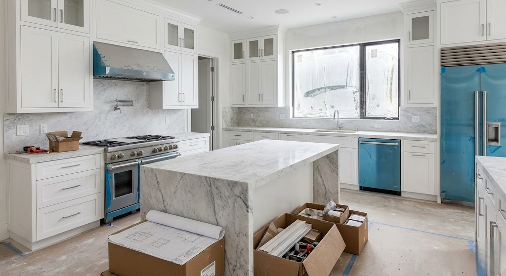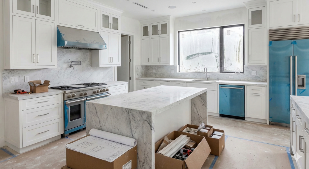 The kitchen is covered in construction dust and debris. Appliances still have protective plastic film, and cardboard boxes with materials are on the floor.