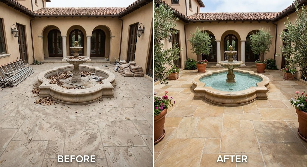 Before: The courtyard and fountain are dirty with dust and construction debris.