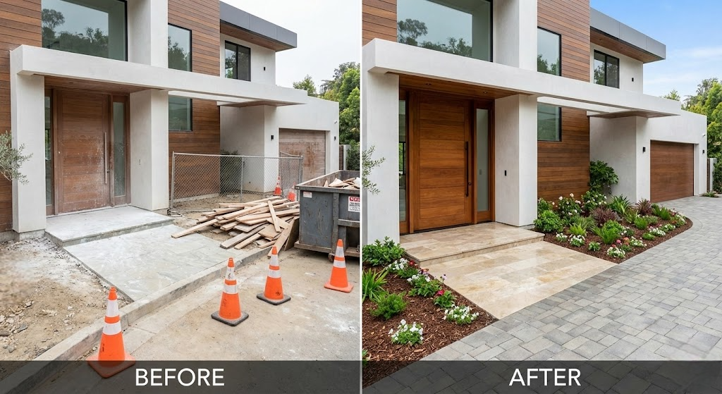 After: The area is pristine, with a clean driveway, finished landscaping, and a sparkling front door.