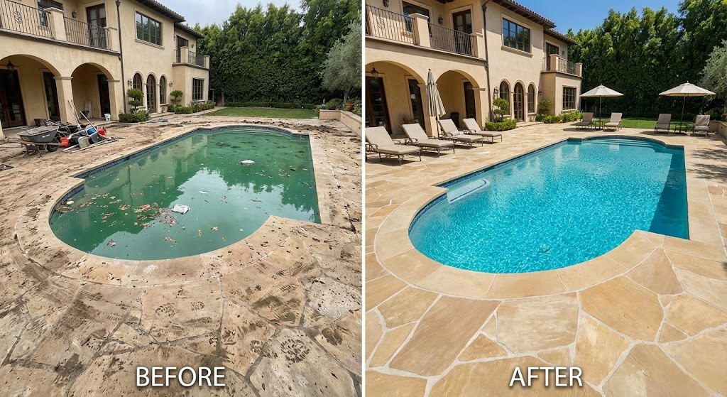 After: The pool is sparkling blue, the patio is power-washed and clean, and pool furniture is neatly arranged.
