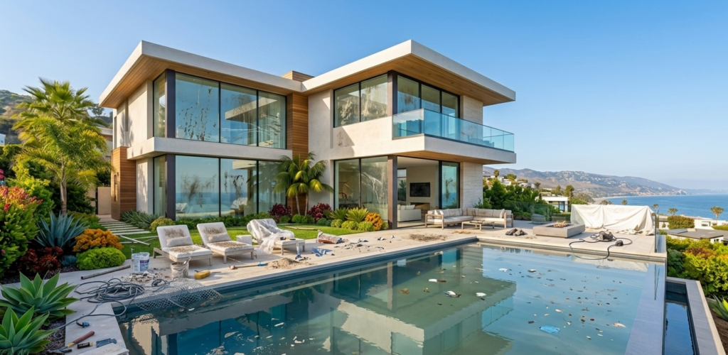 This pair shows the cleaning of a Beverly Hills villa’s backyard pool area, a common post-construction task.